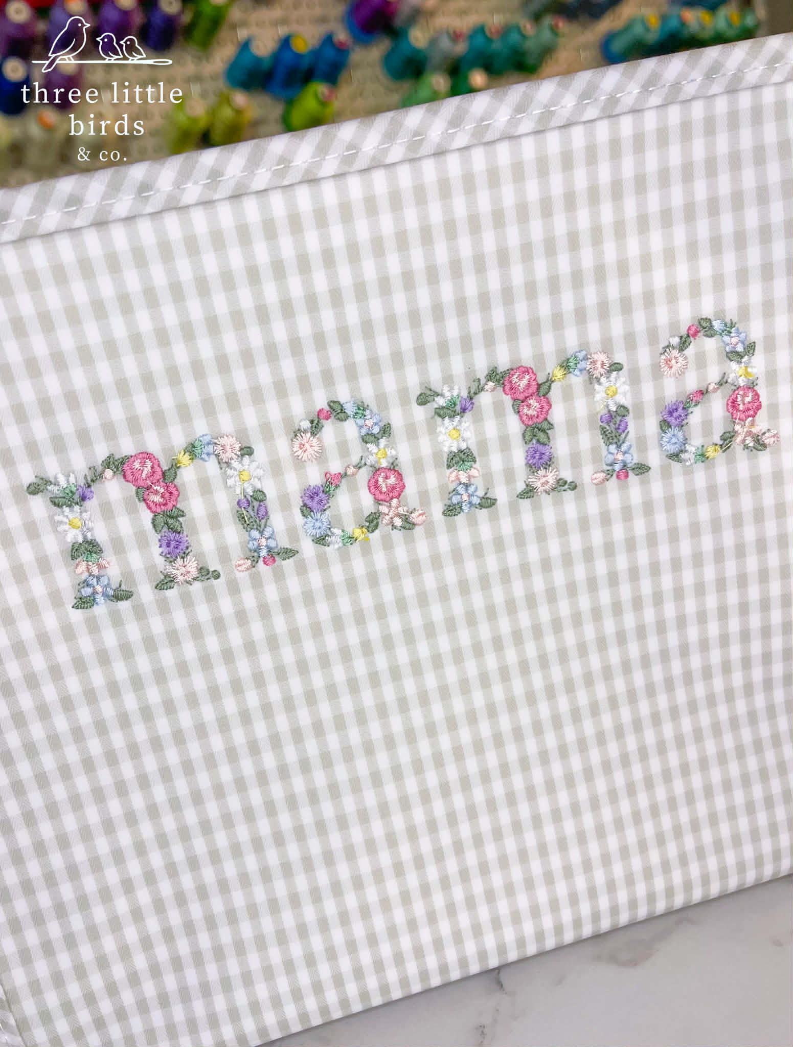 Our best seller - The Roadie! The largest of the Roadie family and our go to for all things travel. Ideal for sunscreen, diapers, wipes, snacks, chargers, toys, cosmetics, anything! Features a gorgeous floral font on the Pearl Grey Gingham Large Roadie. Ready to Ship!